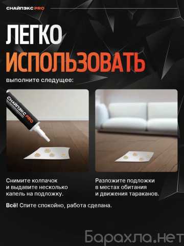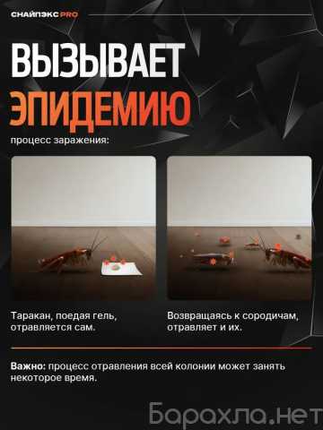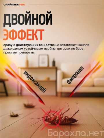 Эффективное средство от тараканов гель Снайпэкс PRO. Почему наш гель так хорошо работает? Во-первых, гель содержит действующее вещество из нового химического класса, к которому у тараканов нет привыкания. Во-вторых, в составе есть второе действующие вещество, с другим принципом действия - это мощный контактно-кишечный яд, уничтожающий тараканов и при контакте с гелем и при его поедании. В-третьих, у Снайпэкс PRO исключительно привлекательная пищевая основа, тараканы с большие удовольствием поедают его и погибают. В-четвертых, гель от тараканов без запаха и долго не засыхает на поверхности, соответственно долго остается привлекательным для насекомых, а значит тараканы поедают гель и погибают на протяжении длительного времени - 2 недели. Средство от тараканов Снайпэкс PRO предназначено для уничтожения синантропных тараканов различных видов, в том числе рыжих, черных, американских, туркменских, а также приманка используется как средство от домашних муравьев (рыжих, фараоновых) на объектах различной категории.
